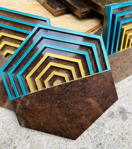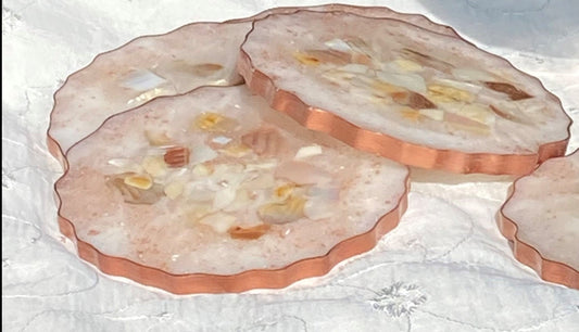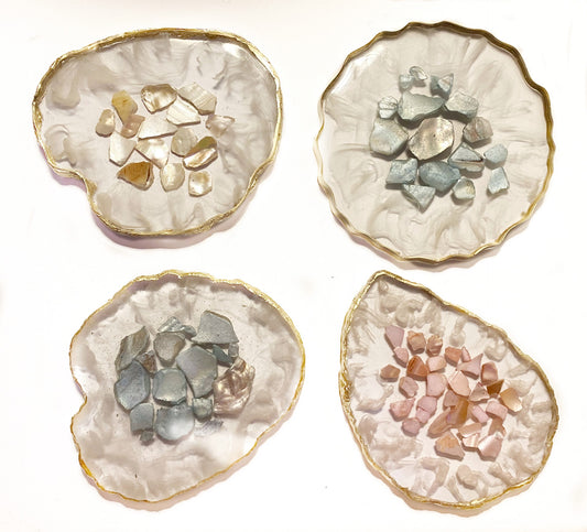 Smukke glasbrikker/coasters med indlæg af strand skaller mm..