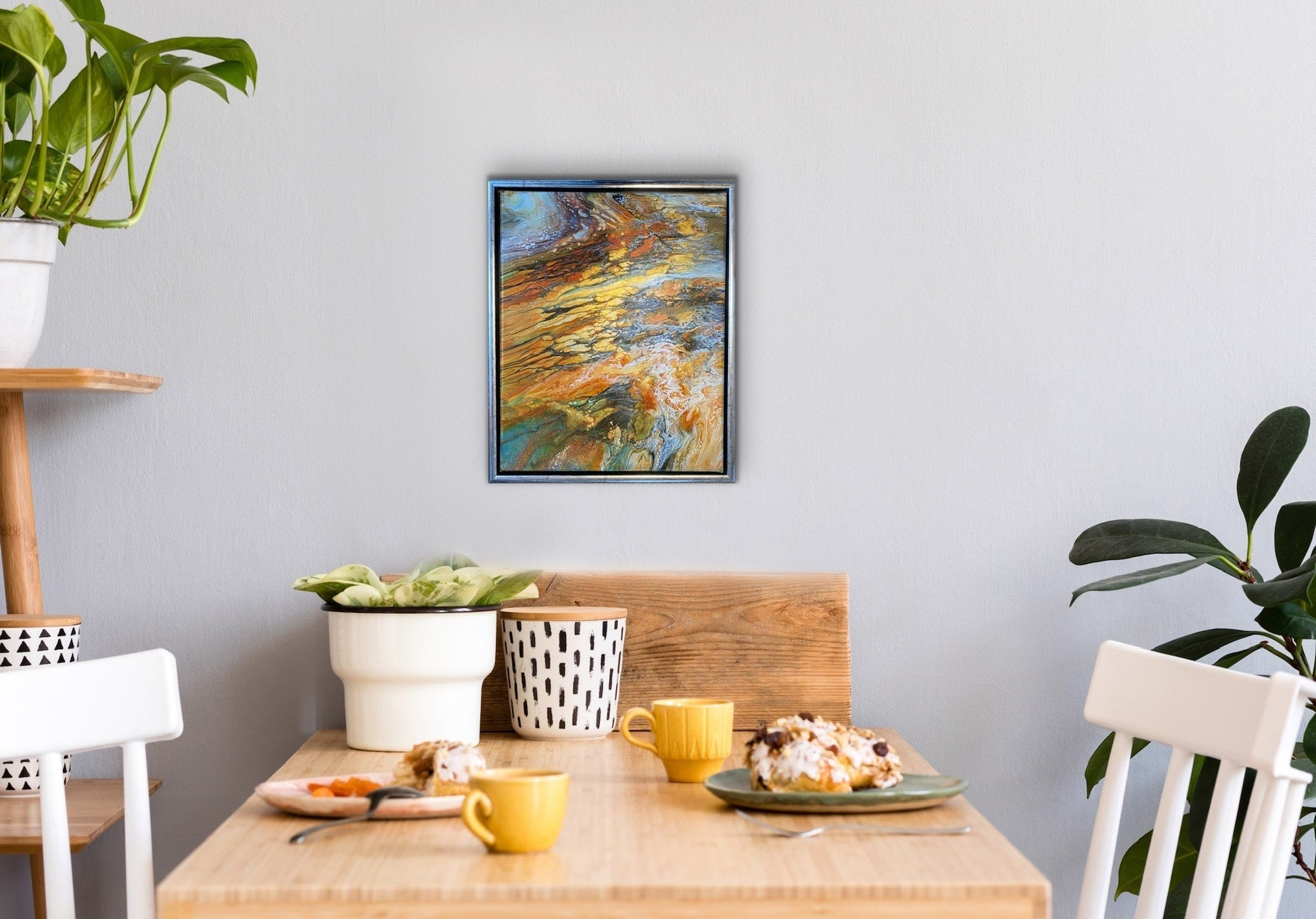 Lille livligt akryl maleri som måler 40 x 50 cm og leveres indrammet i en sølvfarvet ramme.
